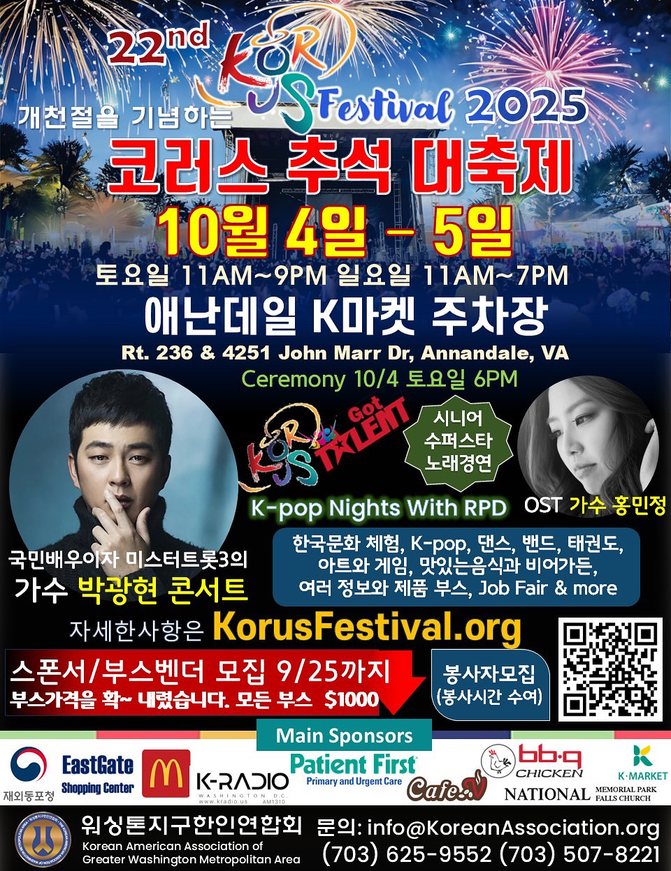 미국 워싱턴 메트로폴리탄 지역 한인사회를 대표하는 가을 축제인 ‘코러스 추석 대축제’가 10월 4일과 5일, 버지니아 애난데일 K마켓 주차장에서 열린다. 이번…