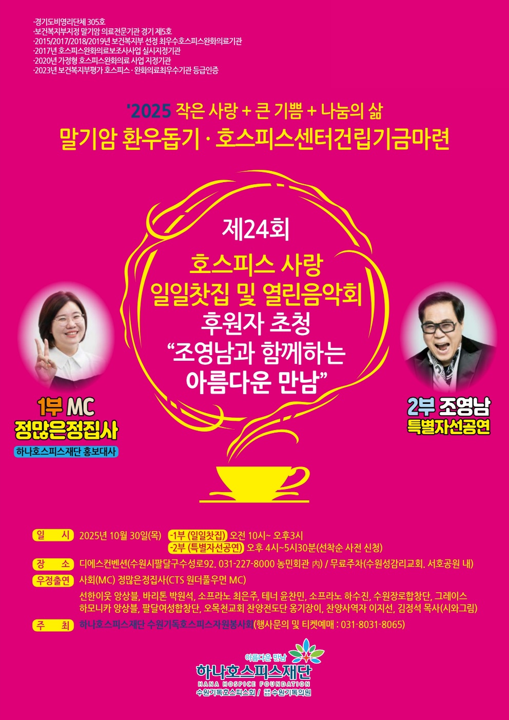2025년 10월 30일 오전 10시, 수원 화서동 구농민회관에서 제24회 ‘호스피스 사랑 일일찻집 및 열린음악회’가 열렸다. 이번 행사는 말기암 환우를 돕고…