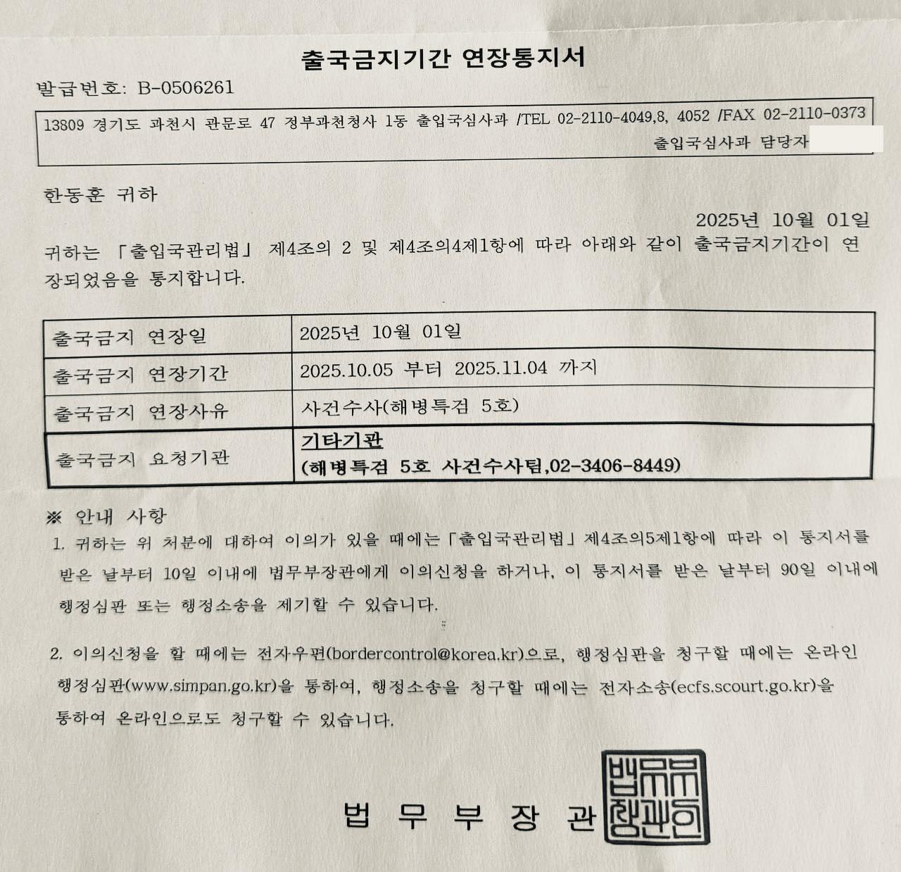 한동훈 전 법무부 장관이 이명현 해병 특검팀으로부터 출국금지 연장 통보를 받았다며 “정치적 목적의 수사”라고 강하게 비판했다. 한 전 장관은 6일…