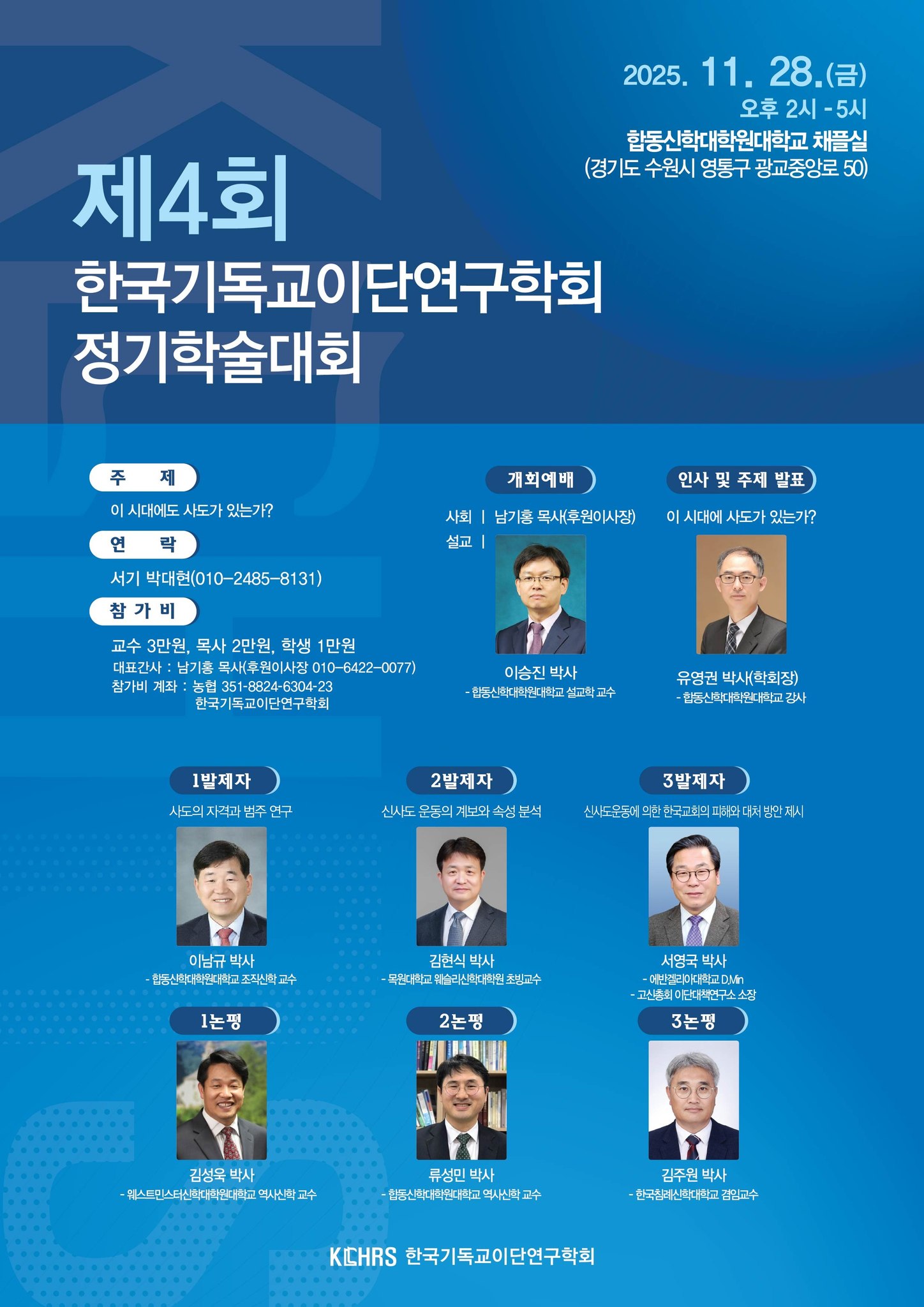 한국이단연구학회가 오는 11월 28일 경기도 수원시 영통구 광교중앙로 50 합동신학대학원대학교 채플실에서 제4회 학술회를 개최한다. 이번 학술회는 오후 2시부터 5시까지 진행되며,…