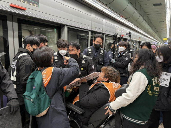 전국장애인차별철폐연대의 지하철 탑승 시위로 18일 오전 서울 도심 출근길이 큰 혼란을 겪었다. 5호선 광화문역에서는 상·하행 열차가 잇따라 무정차로 통과하며 이용객들의…