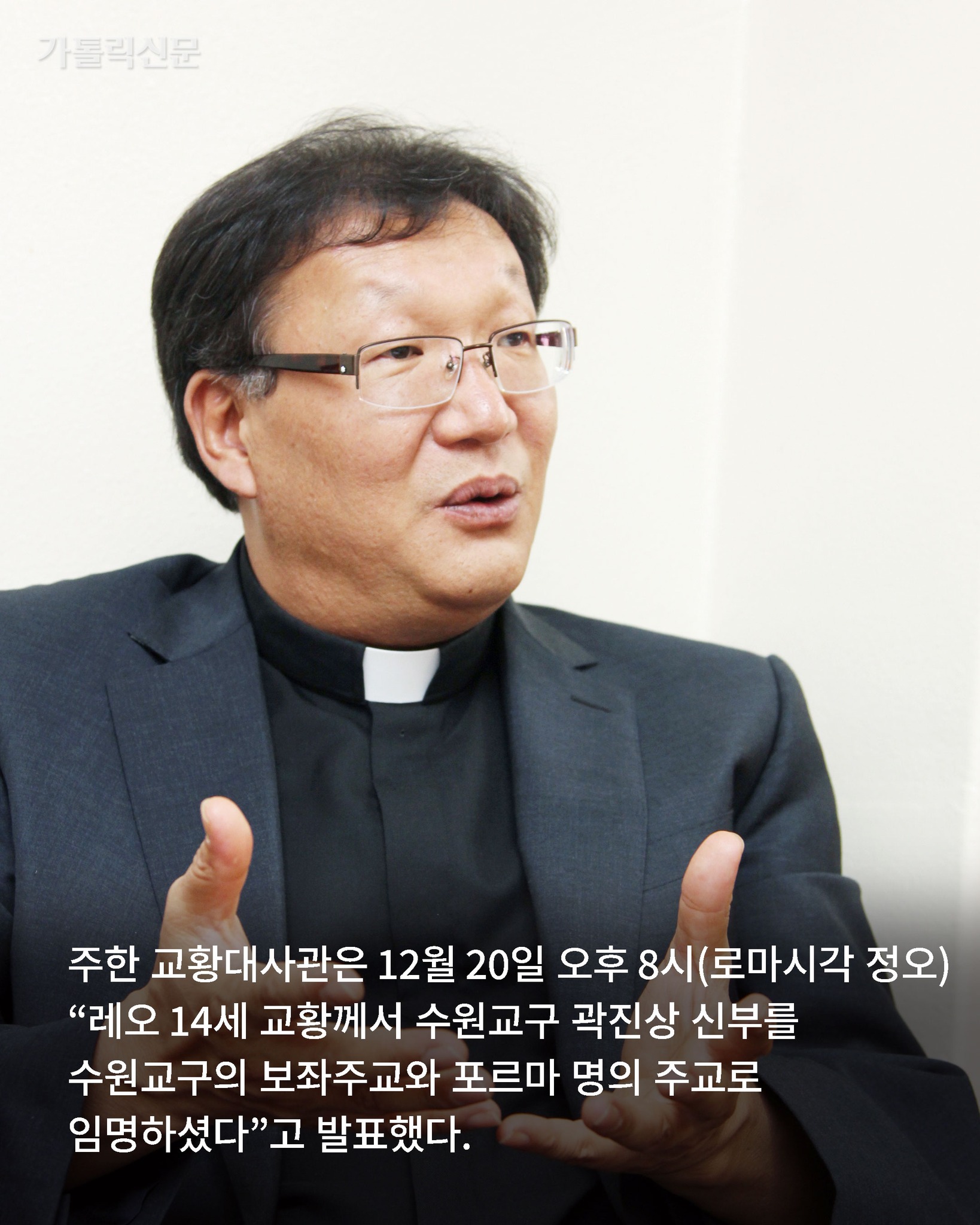 곽진상 신부(제르마노·서판교본당 주임)가 수원교구 보좌주교로 임명됐다. 주한 교황대사관은 12월 20일 오후 8시(로마 시각 정오) 레오 14세 교황이 곽진상 신부를 수원교구의…