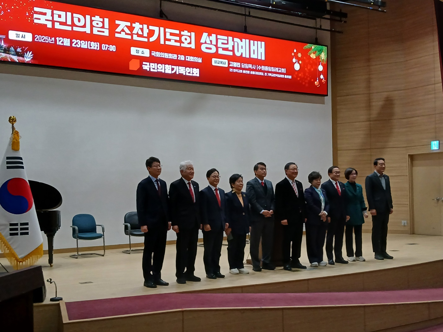 국민의힘기독인회가 23일 오전 7시 서울 여의도 국회의원회관에서 조찬기도회 겸 성탄예배를 열었다. 행사는 국민의힘기독인회 주최로 진행됐다. 이날 예배는 국회의원회관 2층 대회의실에서…