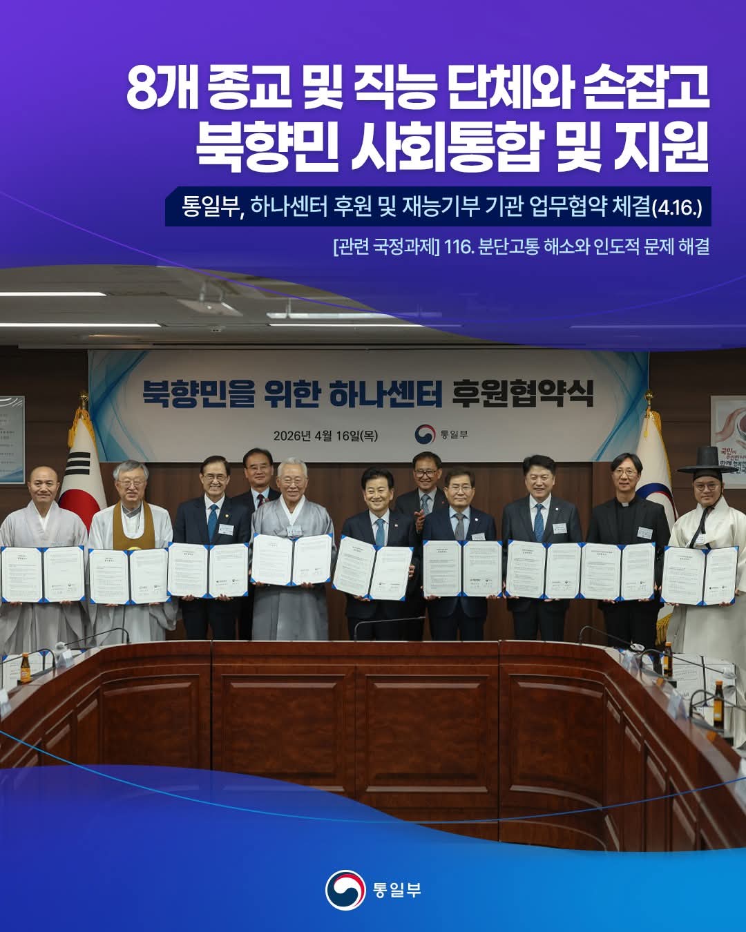 통일부가 북향민의 지역사회 정착 지원을 위해 종교·직능단체와의 민관 협력 확대에 나섰다. 정동영 통일부 장관은 4월 16일 정부서울청사에서 8개 종교 및…