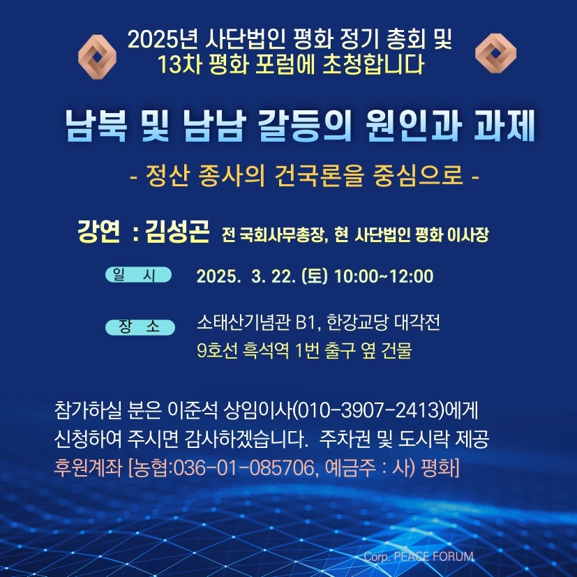 사단법인 평화가 2025년 정기 총회와 제13차 평화 포럼을 개최한다. 이번 포럼은 ‘남북 및 남남 갈등의 원인과 과제 – 정산 종사의…